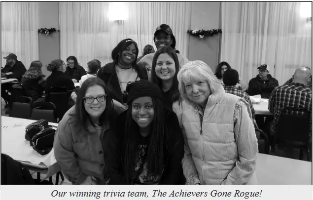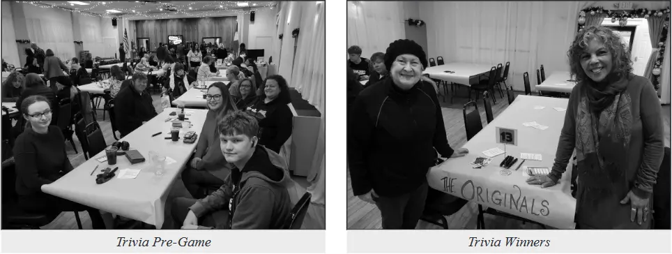 Three photos accompany this article. These photos from the community Trivia Night fundraiser show a warm, well-lit hall decorated with string lights and holiday accents. Groups of adults sit at long tables, with drinks, papers, and pens spread out. One image features a group of participants smiling for a posed photo, reflecting a friendly and inclusive atmosphere. Another shows the full room engaged in the event, with a screen at the front indicating trivia activities. A final image highlights a winning team standing beside their table labeled “The Originals,” smiling proudly with their materials.
