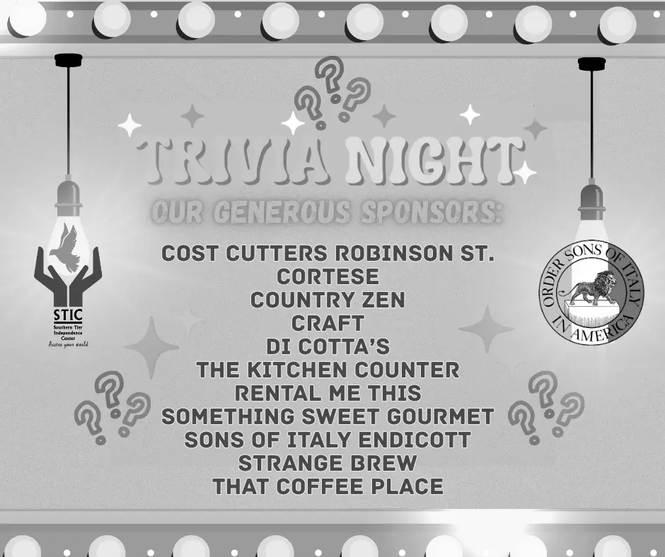 Our 3rd annual STIC Trivia Night fundraiser raised the bar, becoming by far our most successful Trivia Night by a landslide. Thank you to Sons of Italy in Endicott for hosting us and for the delicious food, our amazing sponsors, and of course, all the teams who played to win and helped support people with disabilities. We hope you are all looking forward to next year.